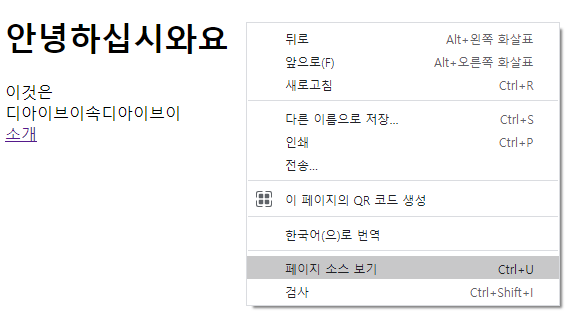 만든 페이지에서 마우스 우클릭 - 페이지 소스 보기 를 클릭해보자.