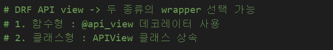함수형의 경우 api_view라는 데코레이터를, 클래스형의 경우 APIView라는 클래스를 상속받는다.