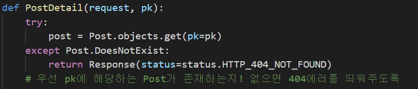 와우. 이번에는 GET, PUT, DELETE 요청을 담당할 PostDetail 함수를 작성해보자.