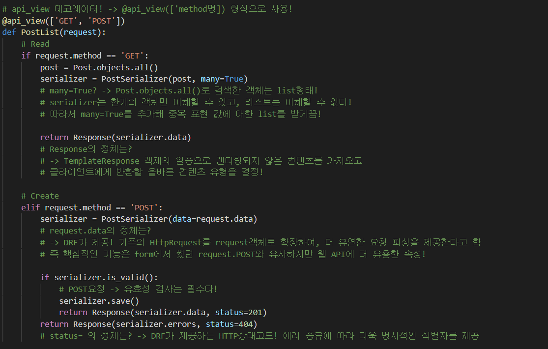 즉 @api_view(['GET', 'POST'])를 통해 GET 요청과 POST요청이 들어올 때는 PostList함수를 작동시키는 것.