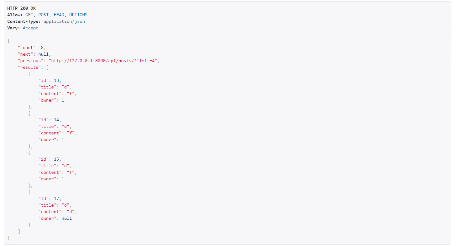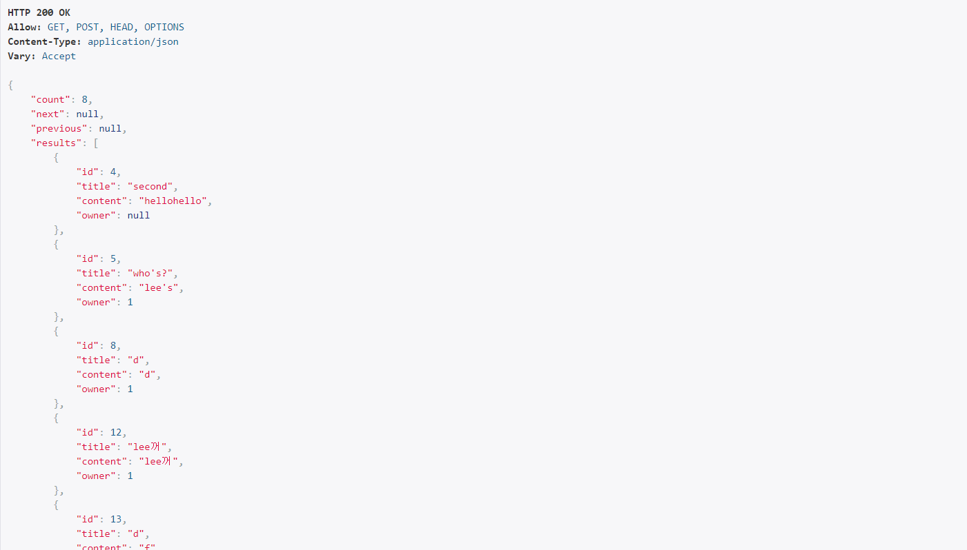 또한 PageNumberPagination을 적용했기 때문에 next의 URL이 페이지 번호만으로 이뤄진 걸 볼 수 있다.