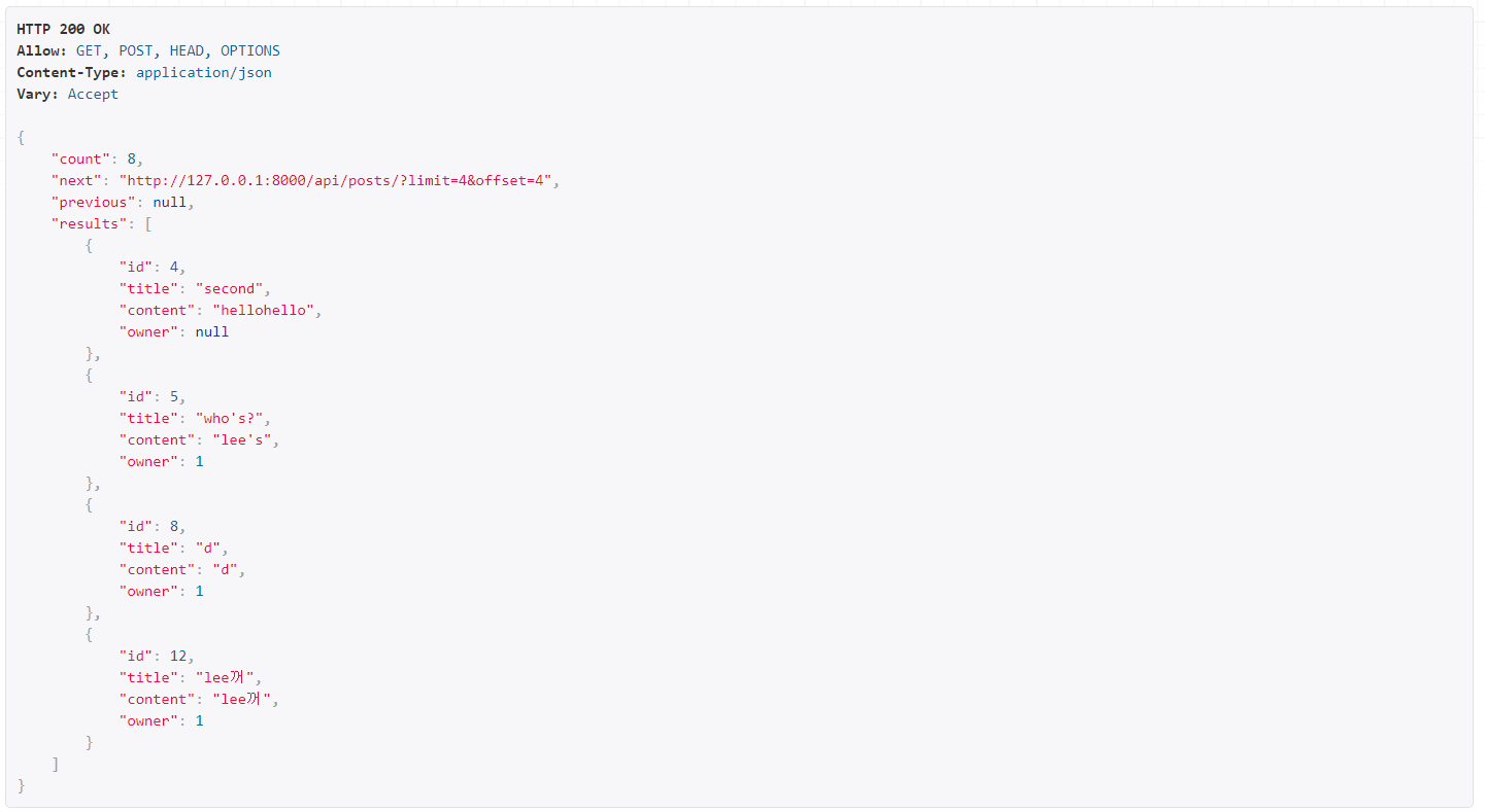 pagination_class를 적은 결과를 보여줄 StandardResultsSetPagination로!