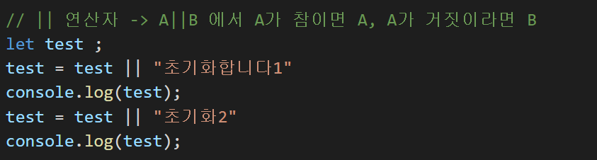 test = test ? test : "초기화1"; ← 요 녀석은 test = test 가 참이면 test를, 거짓이면 "초기화1"을 반환한다.
