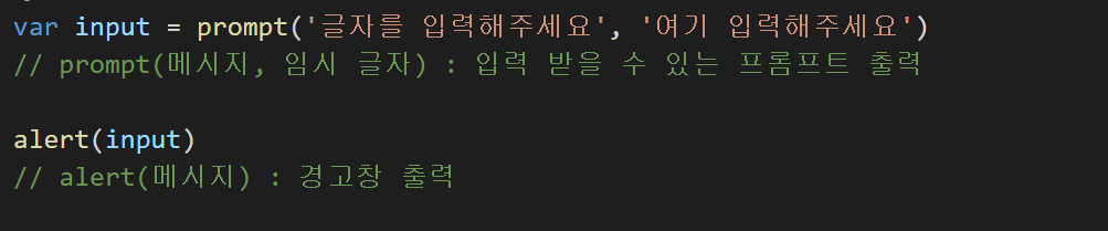 prompt는 입력 받을 수 있는 프롬프트를, alert는 경고창을 출력한다.