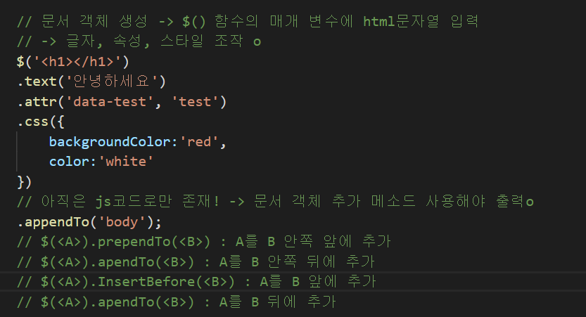 $('<h1></h1>')을 통해 h1 태그를 하나 만들고,